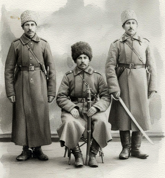 kov-os-#82: Menda Kahn sits in the middle. He served for nine years in the Russian Tsar Nicholas II imperial army. Part of his service was during World War One. |