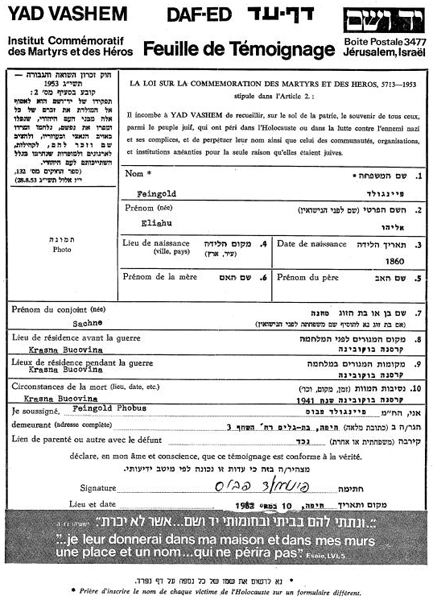 Yakov Feingold was born in Radauc, Romania to Dov. Prior to WWII he lived in Radauc, Romania. During the war he was in Czernowiec, Romania. Iakov was murdered/perished in the Shoah at the age of 22. This information is based on a Page of Testimony (displayed on left) submitted by his brother Yosef.