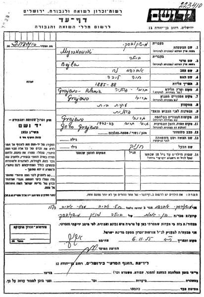 #mish-13: Myszkowski Grajewo, Poland Jzak Yisrael Myszkowski was born to Moshe and Zelda. He was a merchant and married to Rivka. Prior to WWII he lived in Grajewo, Poland. During the war he was in Grajewo, Poland. Jzak Yisrael was murdered in the Shoah. This information is based on the records/documents displayed below: Grajewo, Poland |