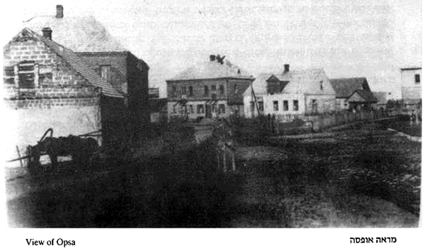 Opsa I remember it as if it were only yesterday. The fire started in Baruch-Itse's house. The tongues of flame fanned by the spring breeze spread like wildfire, enfolding roof after roof, house after house. The church bells pealed ominously, then suddenly fell silent as the fire began to engulf the sacred building and the burning crosses and massive bells came crashing to the ground. Opsa was again rebuilt but the fire was not forgotten. Interwoven into the fabric of the lives of its inhabitants it frequently served as a landmark. Thus they would say: "This still happened before the fire." Or "Do you remember the house before the fire?" Despite its small Jewish population of barely a few hundred souls, the communal and spiritual life of Opsa was multifaceted and replete with cultural activities, clubs, social circles, and political parties. It had two synagogues – a Chassidic and a Mitnaggid synagogue-cum house of study. The children attended "Cheder," a religious afternoon school, or studied in the Braslaw yeshiva (Torah academy)_ or in the Hebrew school Yavneh. The Betar was the predominant Zionist movement and attracted a large following among the youth. As in most Jewish shtetlach in the interwar period, the period engaged in business or plied trades. They were tailors, cobblers, tinkers, bankers, and so on. The Jews of Opsa, like those of Braslaw and environs, perished at the hands of the Nazis. |