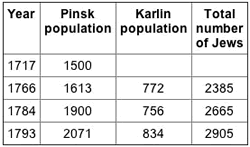 In 1717 there were approximately 250-275 Jewish homes, in which about 300 families resided, which adds up to close to 1500 souls. Over the 18th century, until 1793, the Jewish population of Pinsk grew as follows: