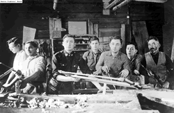 #vili-ym-2: A pioneering training commune (hachshara) of the Betar youth movement in Vileyka. These young people are working in the carpentry of Shmuel Lapidot. Photographed on Dec. 26, 1935.
