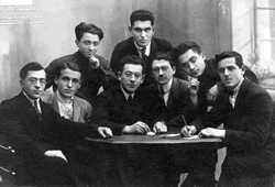 Picture 9. Delegates to a congress of the Tse'irei Zion movement, Vilnius 1921. Shlomo Farber (front row, second from the right); Menachem Rudnicki - Adir (front row, fourth from the right); Chaim - Shalom Kopilowicz (front row, third from the left); Avraham Solowiejczyk (front row, on the left); Lewin (standing, second from the right; first name unknown), a delegate from Molodechno; Israel Shafir (standing, third from the right); Nachum Kantorowic (standing, fourth from the right); Israel Marminski - Marom (standing, fifth from the right); and Margolis (standing, fourth from the left; first name unknown), a delegate from Svencionys. Also in the photo, seated: A. Katz, Shraga Antovil, Reuven Boniak, Shlomo - Yitzhak Alper, Eliahu Rodnicki, Nechama Horwic, Yitzhak Walk, Chaim Fejgin, and Yitzhak Schweiger, a Zionist emissary from Mandatory Palestine.