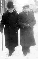 Nachbush (right) and Dr. Jakob Wygodzki, walking on a snowy street. 1939.