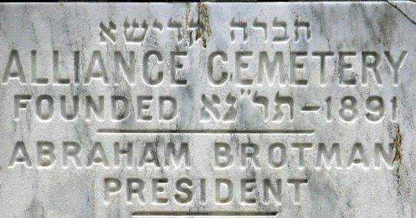 5. Memorial stone for Abraham Brotman, President of the Alliance Cemetery Society, probably a burial society.