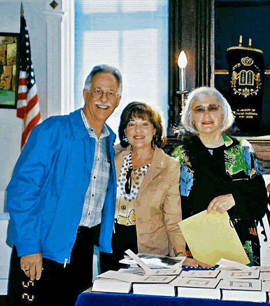 11. From left: Steven Perskie, (grandson of Judge Joseph B. Perskie), his wife, Barbara Fendrich Perskie, and me with a broken arm. This was taken at a family reunion at the former Alliance colony, in NJ, a few years ago. We are in the synagogue. |